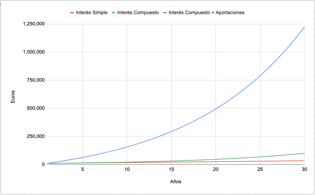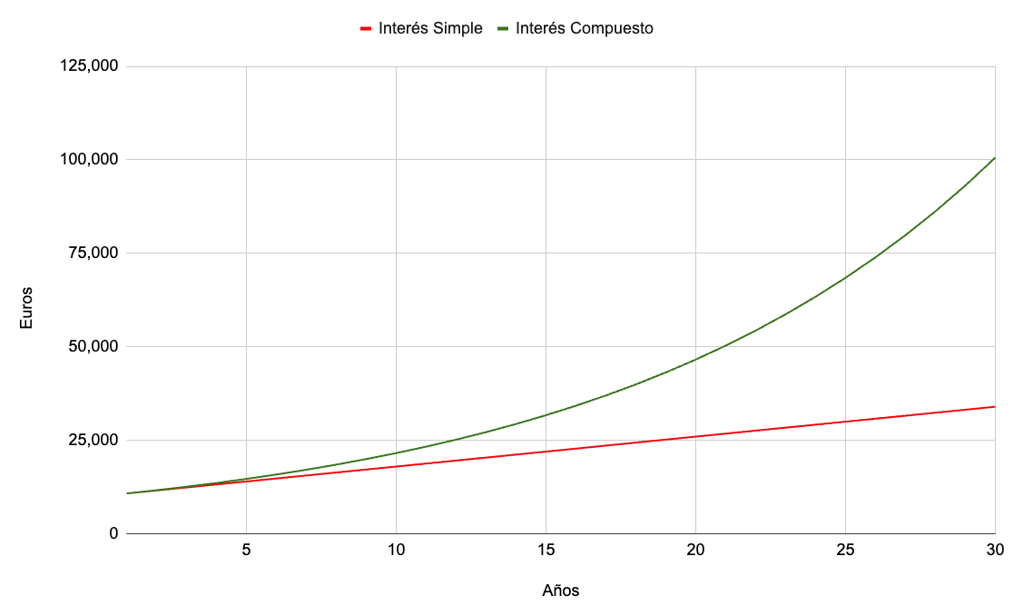 Por ejemplo, si inviertes 1,000 euros a una tasa de interés anual del 5%, después del primer año tendrás 1,050 euros. En el segundo año, la tasa de interés del 5% se aplica a los 1,050 euros, lo que da como resultado 1,102.50 euros. Con cada período, los intereses se calculan sobre un monto mayor, lo que acelera el crecimiento de tu inversión.