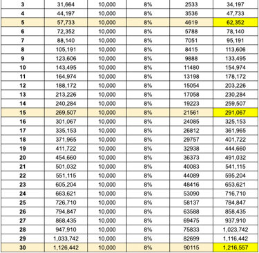 Supongamos que empiezas con 10.000 euros, consigues una rentabilidad del 8% anual y ahorras unos 830 euros al mes (10,000 euros al año):