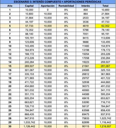 Finalmente vamos a revisar la tabla utilizada en el artículo sobre el interés compuesto dónde se puede apreciar el impacto de las aportaciones periódicas, la rentabilidad y el efecto bola de nieve muy claramente. Basicamente si desde una edad tempran se ahorran 10,000 euros al año, que vienen a ser 120 euros al mes, en 30 años estos de convierten en mas de 1.2 millones de euros: