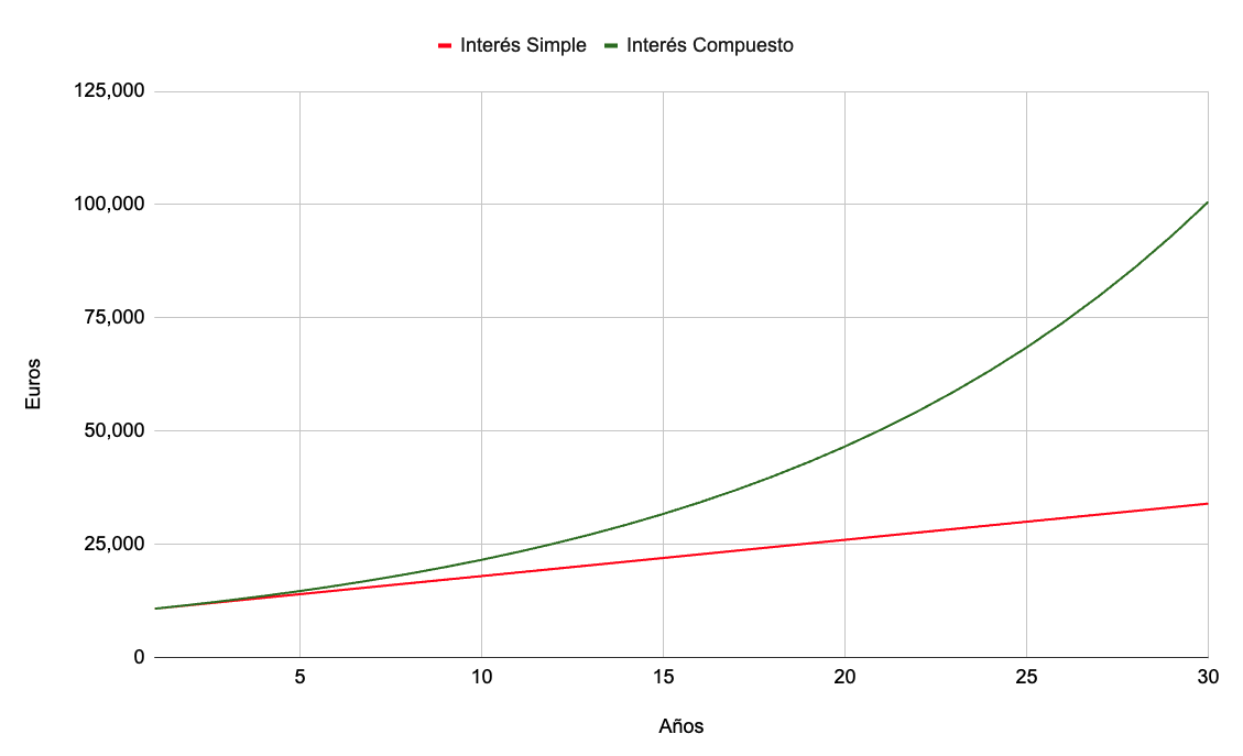Por ejemplo, si inviertes 1,000 euros a una tasa de interés anual del 5%, después del primer año tendrás 1,050 euros. En el segundo año, la tasa de interés del 5% se aplica a los 1,050 euros, lo que da como resultado 1,102.50 euros. Con cada período, los intereses se calculan sobre un monto mayor, lo que acelera el crecimiento de tu inversión.