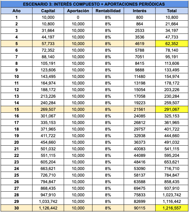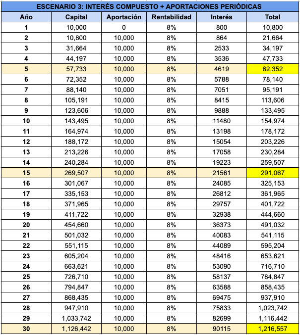 Escenario 3: Interés Compuesto y Aportaciones Periódicas